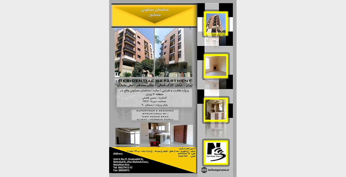project factsLocation : Tehran - Iran Site area : 400 m2 Project area : 1750 m2 Number of stories : 7 Building height : 21 m Market : Residential Weight : 192 ton Service : Structural engineering - Supervision See also ...